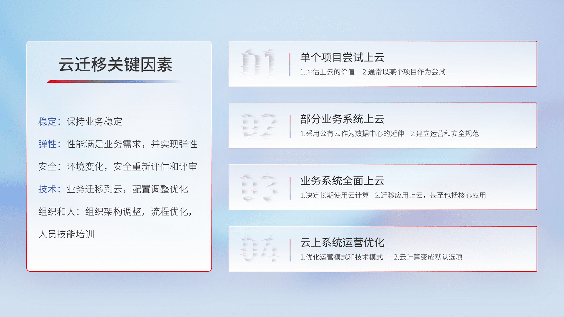 结合实际业务,,,,从规划设计、、、、云平台选型、、、、云原生改造、、数据迁移、、、、集成交付,,迁移全过程为客户识别最佳上云路径,,,做好风险识别管理,,设计网络架构、、身份权限、、安全审计合规、、操作审计、、、、日志审计、、、、监控告警策略、、、、多站点容灾设计等,,,对云上基础设施进行整体规划,,,,提升IT治理水平,,以满足弹性、、、高可用、、高性能的需求。。。。